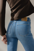 The Isy has a high waist and a wide-leg fit that flares from the knee. Made from sustainable 11 oz. stretch denim with organic cotton, recycled cotton, and TENCEL™ Lyocell, it combines comfort and eco-friendliness. The fresh fade color gives this classic style a modern, fresh look. Zip fly.