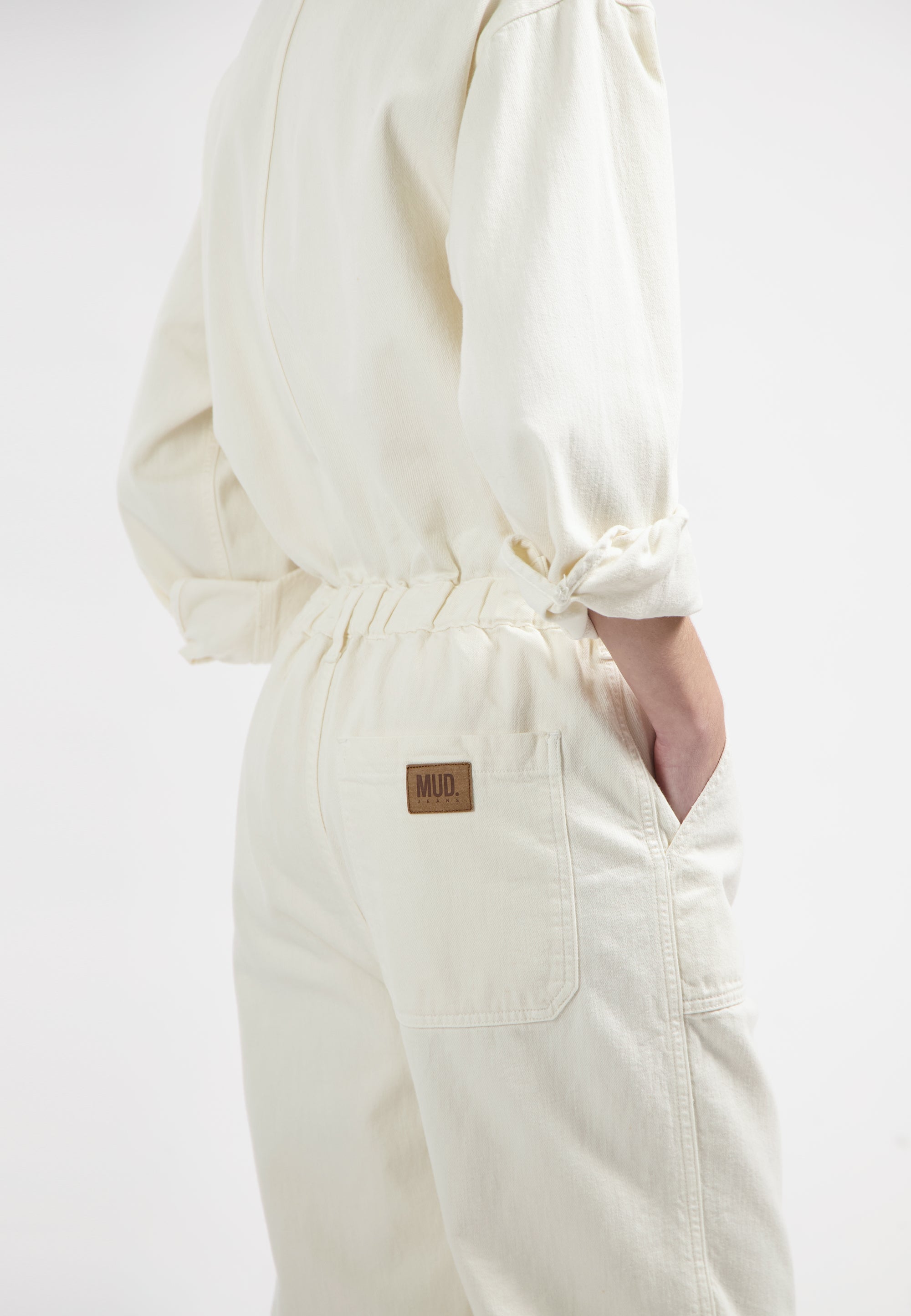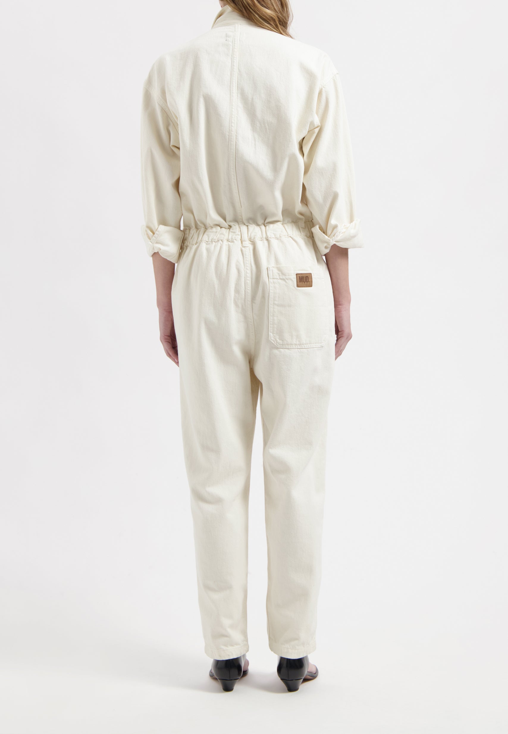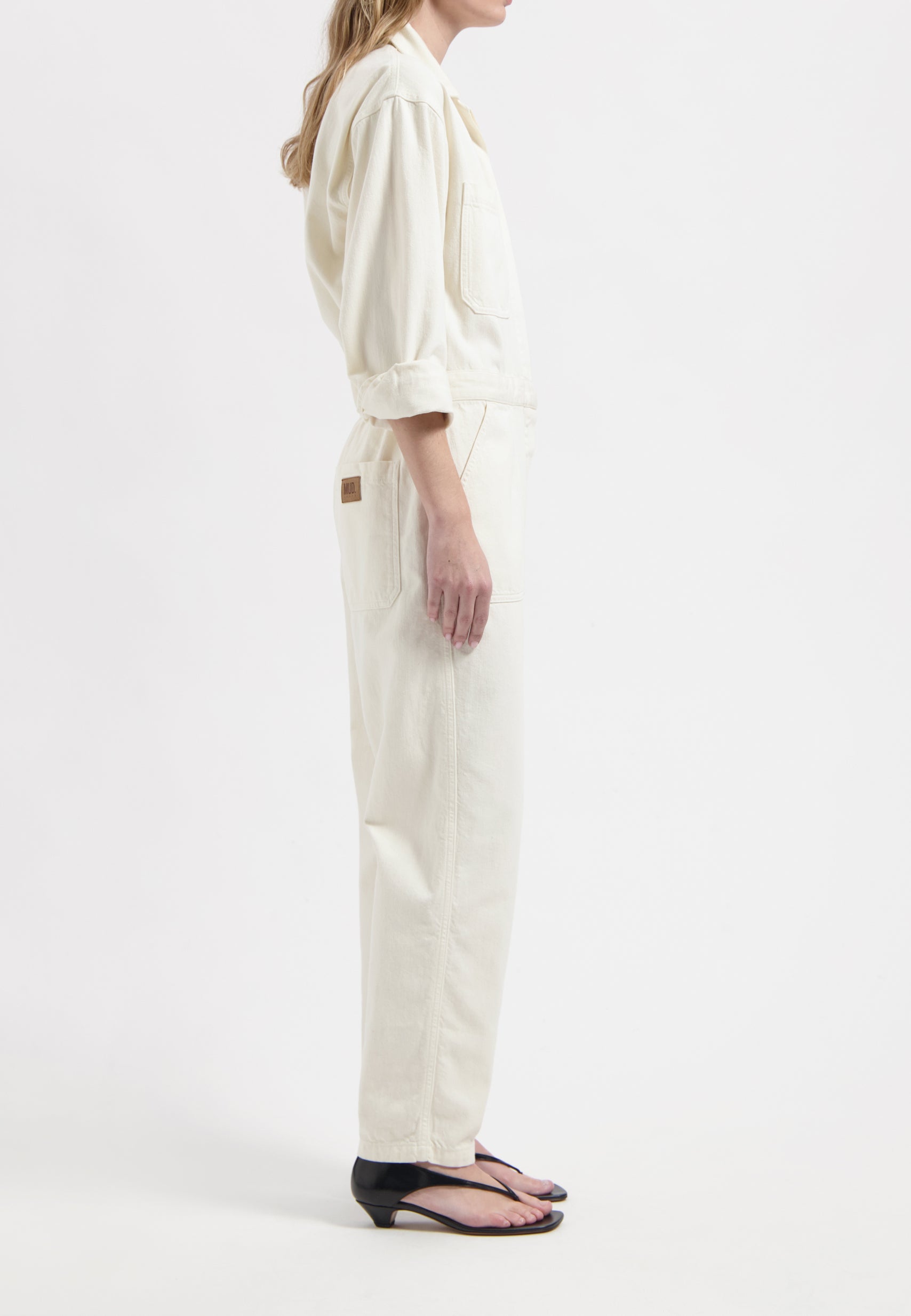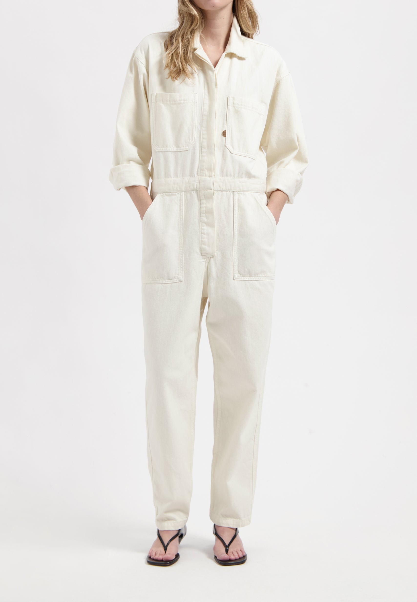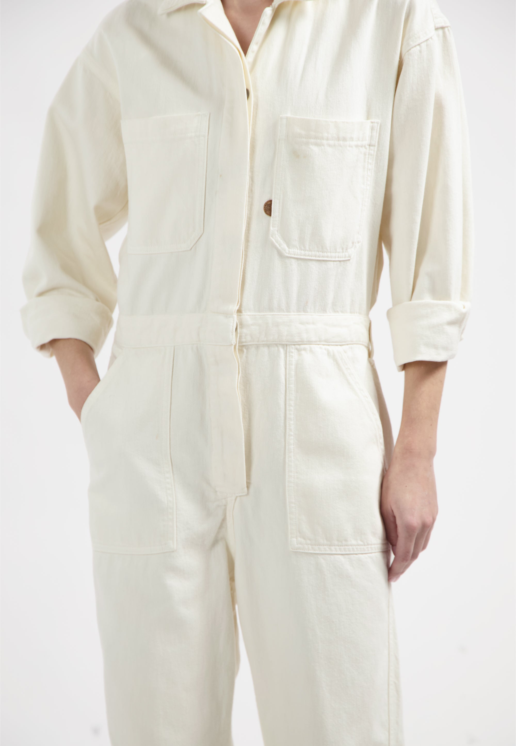 Make room in your closet for Uma, our long-sleeve, full-length denim jumpsuit with a cool utility vibe. Featuring a button-down placket, double top flap pockets plus side slash pockets and a bag pocket. Belt loops help accent the waistband. Made in our lightweight, non-stretch, circular and organic cotton fancy weave with denim characteristics.